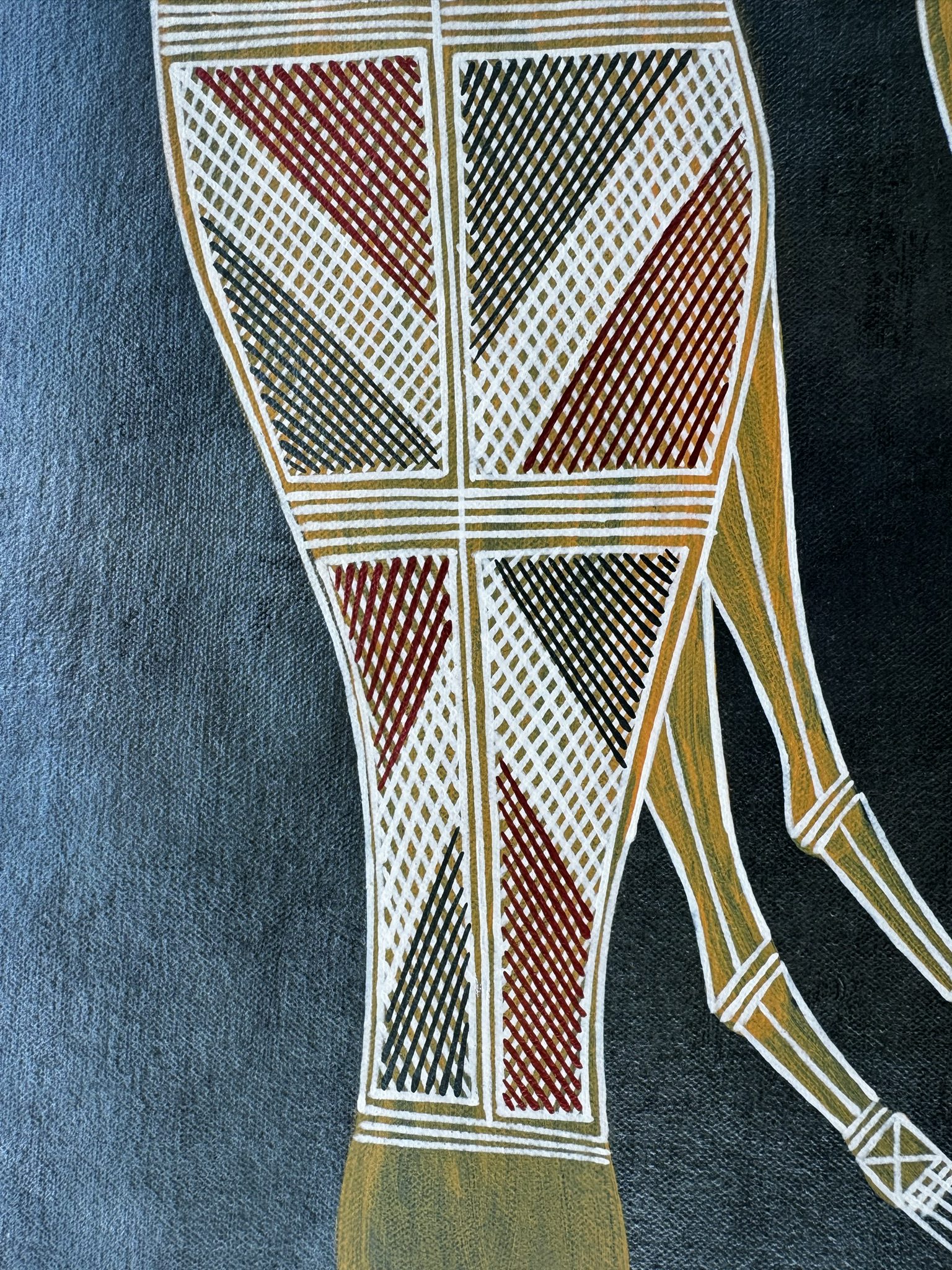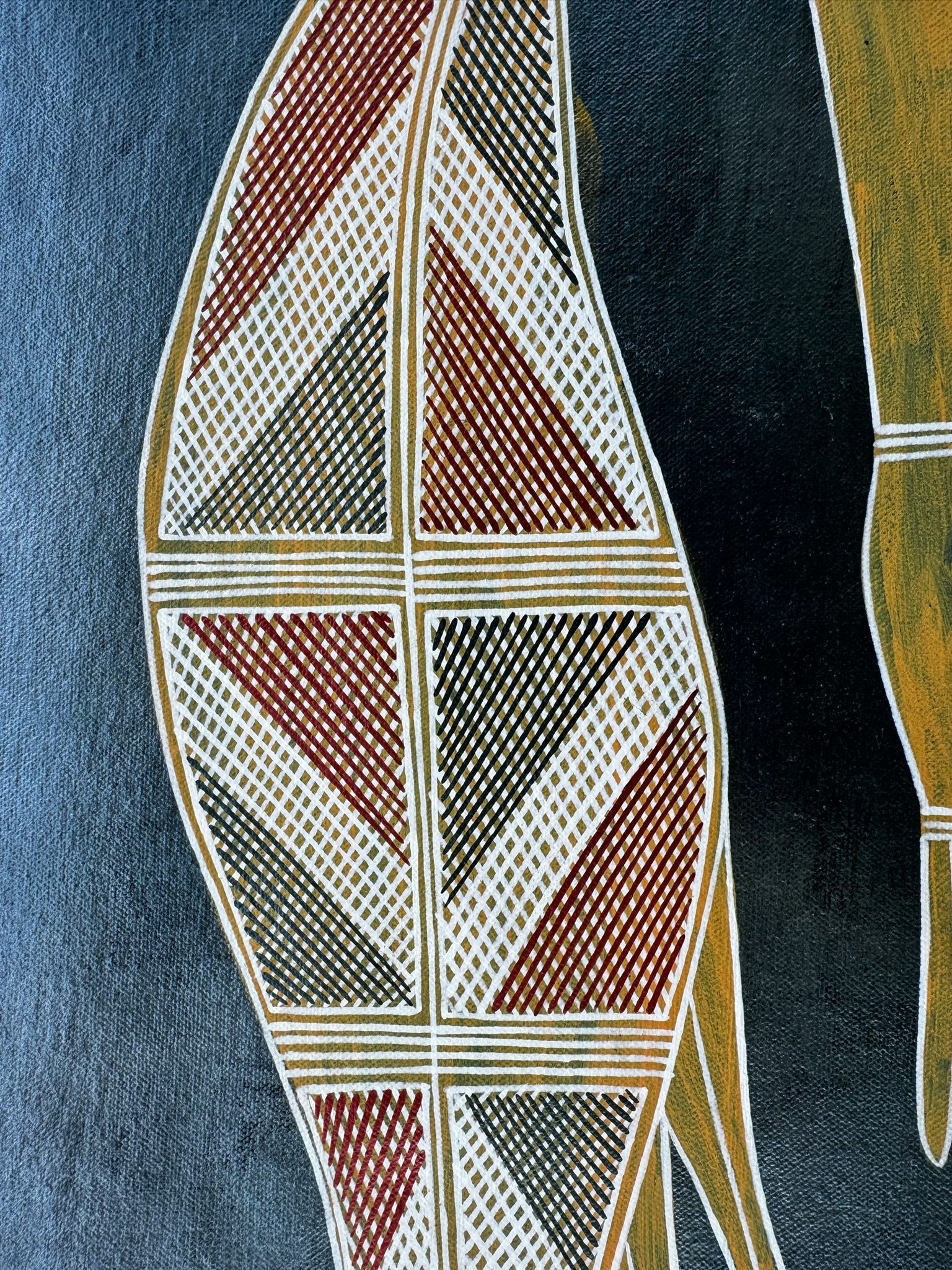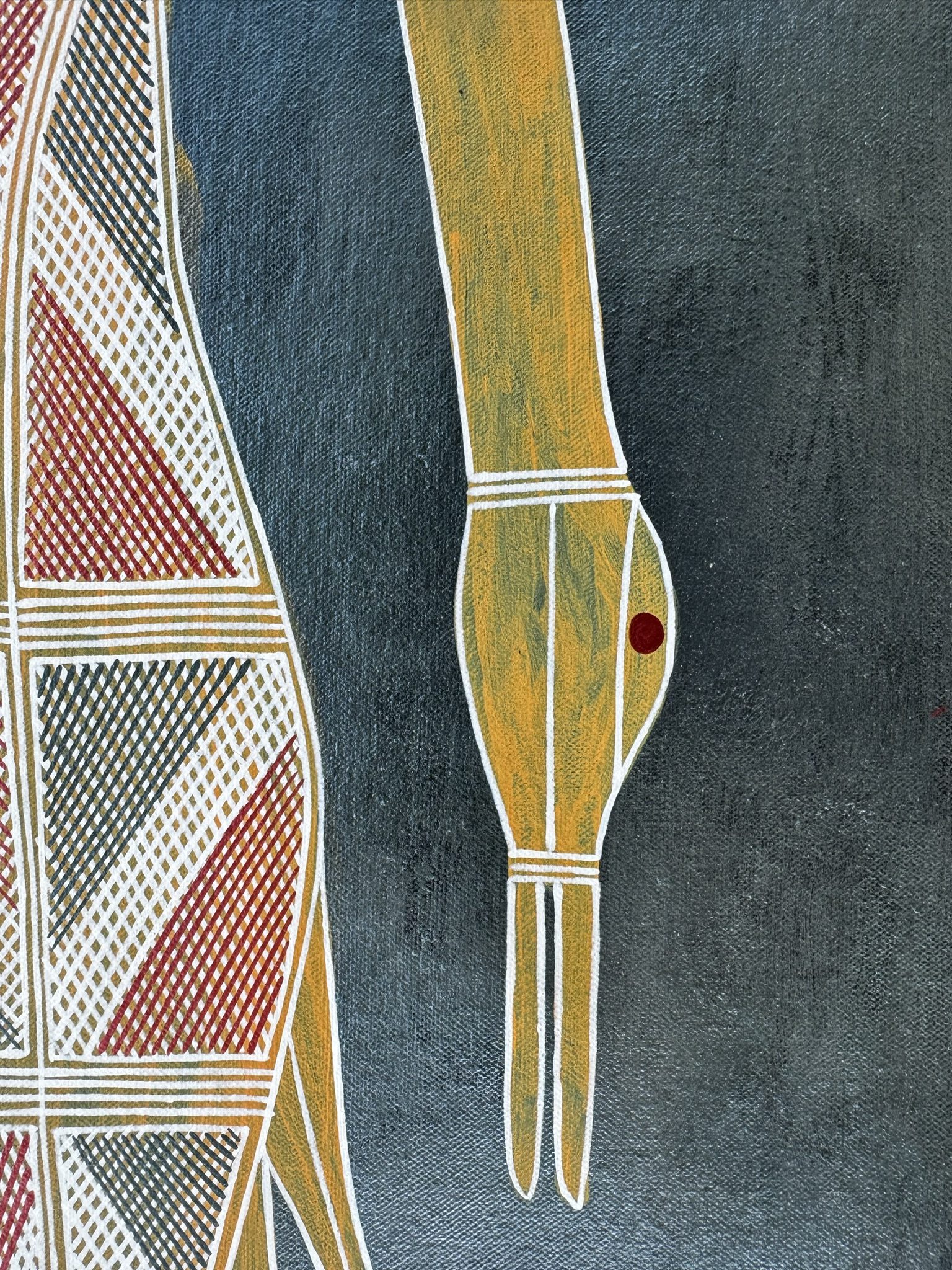 The main language spoken in the Gunbalanya community is Kunwinjku and it has a population of just under 1200 people. Oben comes from a long line of weavers, painters, carvers and ceremonial people. His clan also are associated with the ‘long yam’ dancers, a well-known dance troupe, as dance has been part of their culture for many generations. Some of Oben’s favourite themes to paint are the Eel-tailed catfish, turtles, water lilies, and water birds such as the Magpie Goose (bamurru).
