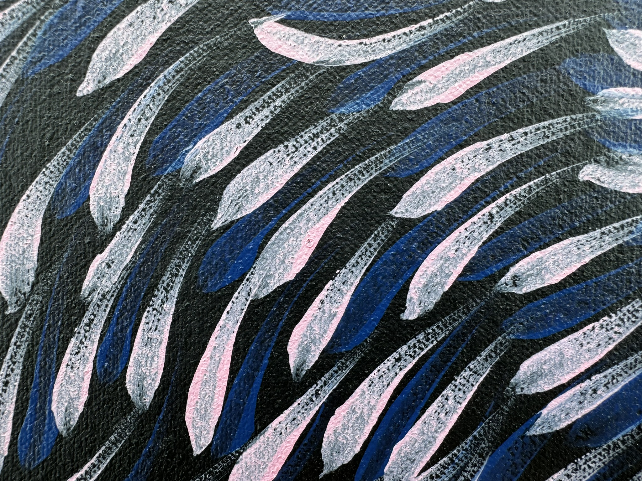 Samantha’s artwork is profoundly influenced by her aunties teachings, particularly the sacred stories of the ‘Bush Medicine Leaves.’ This design is not only a visual representation but also a cultural emblem, reflecting the significance of the native shrub that thrives in Utopia. The community relies on these leaves for their remarkable medicinal properties, making the artwork a tribute to both the land and the traditional knowledge that has been passed down through generations.