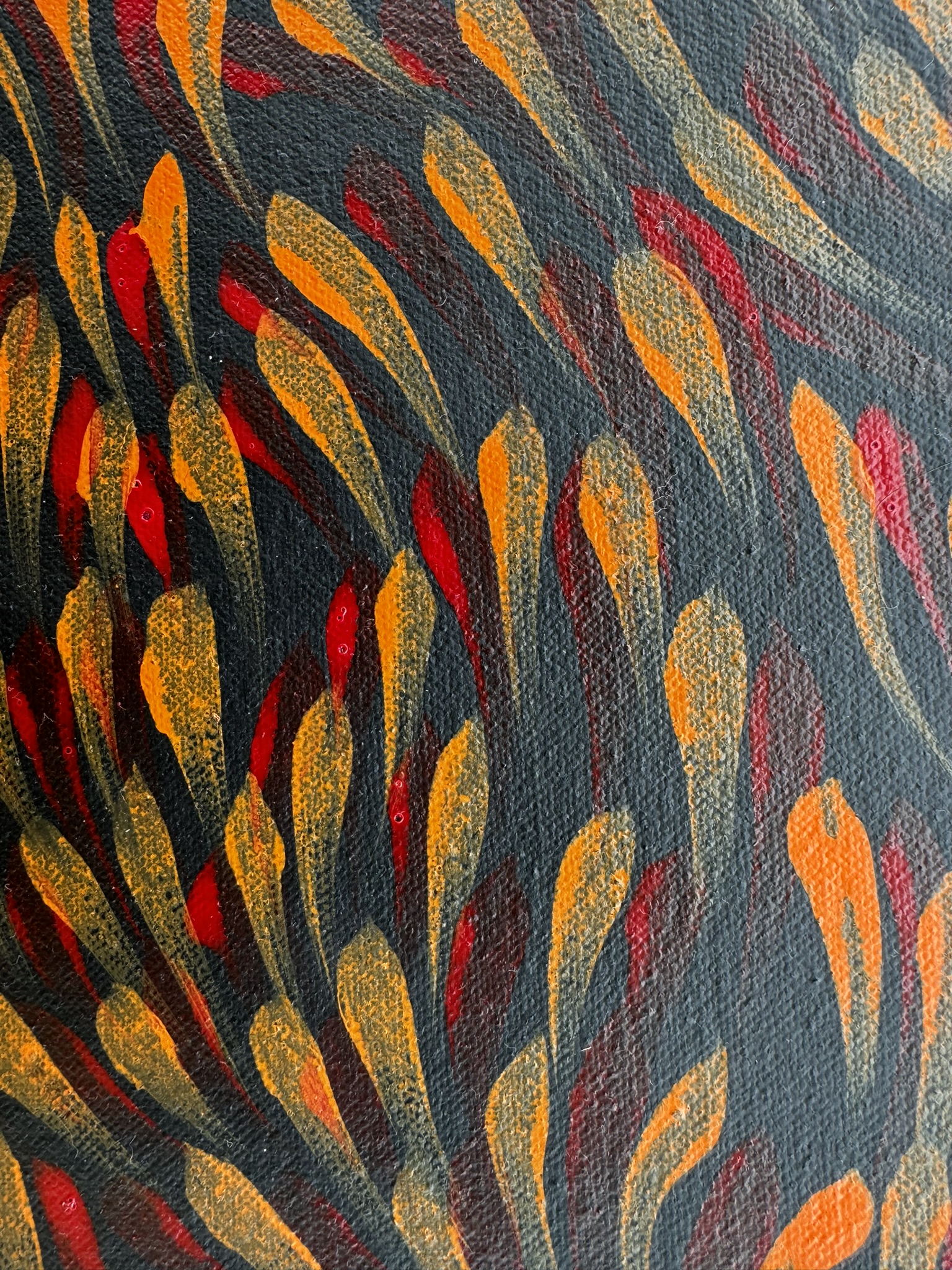 Samantha’s artwork is profoundly influenced by her aunties teachings, particularly the sacred stories of the ‘Bush Medicine Leaves.’ This design is not only a visual representation but also a cultural emblem, reflecting the significance of the native shrub that thrives in Utopia. The community relies on these leaves for their remarkable medicinal properties, making the artwork a tribute to both the land and the traditional knowledge that has been passed down through generations.