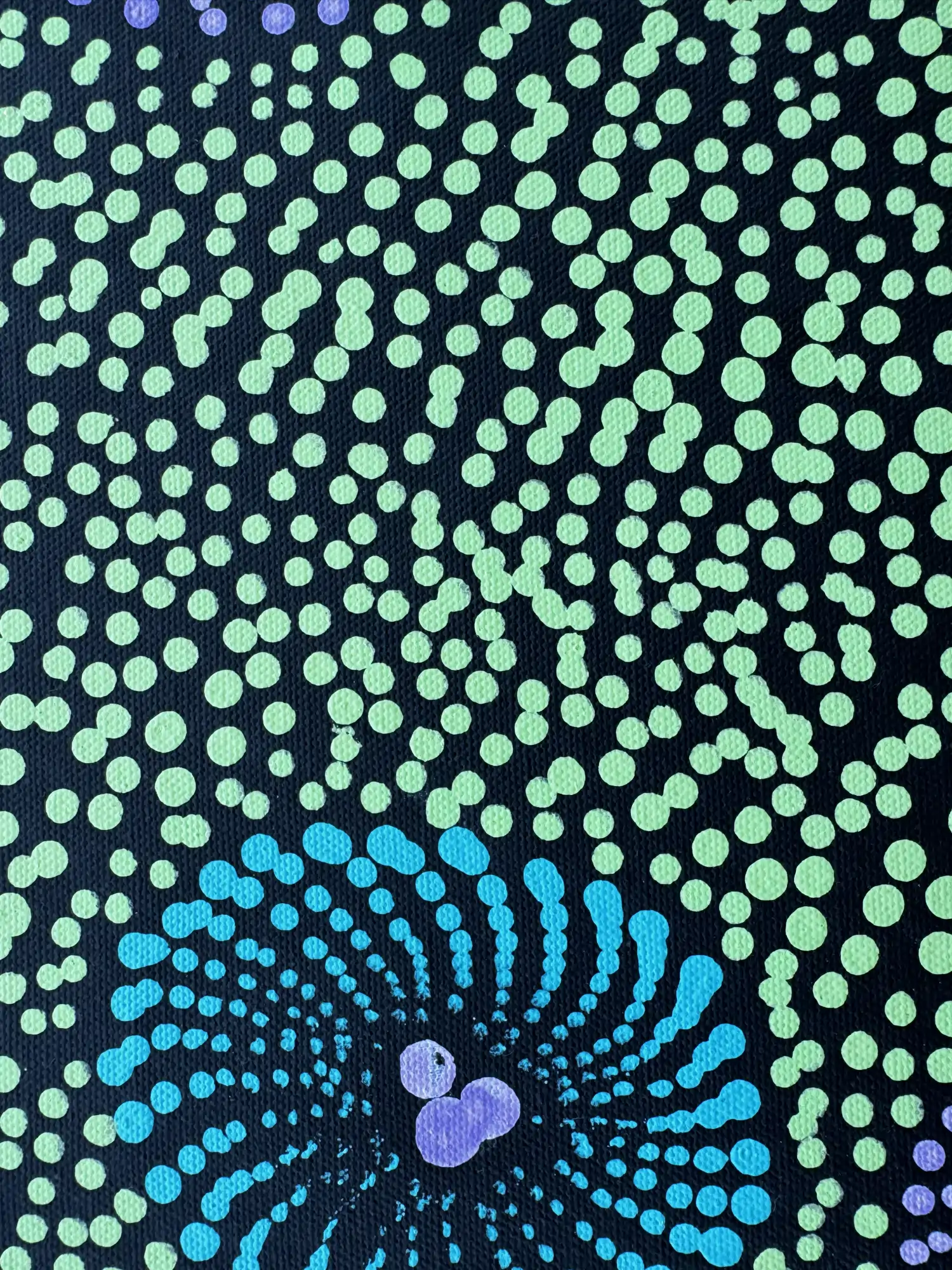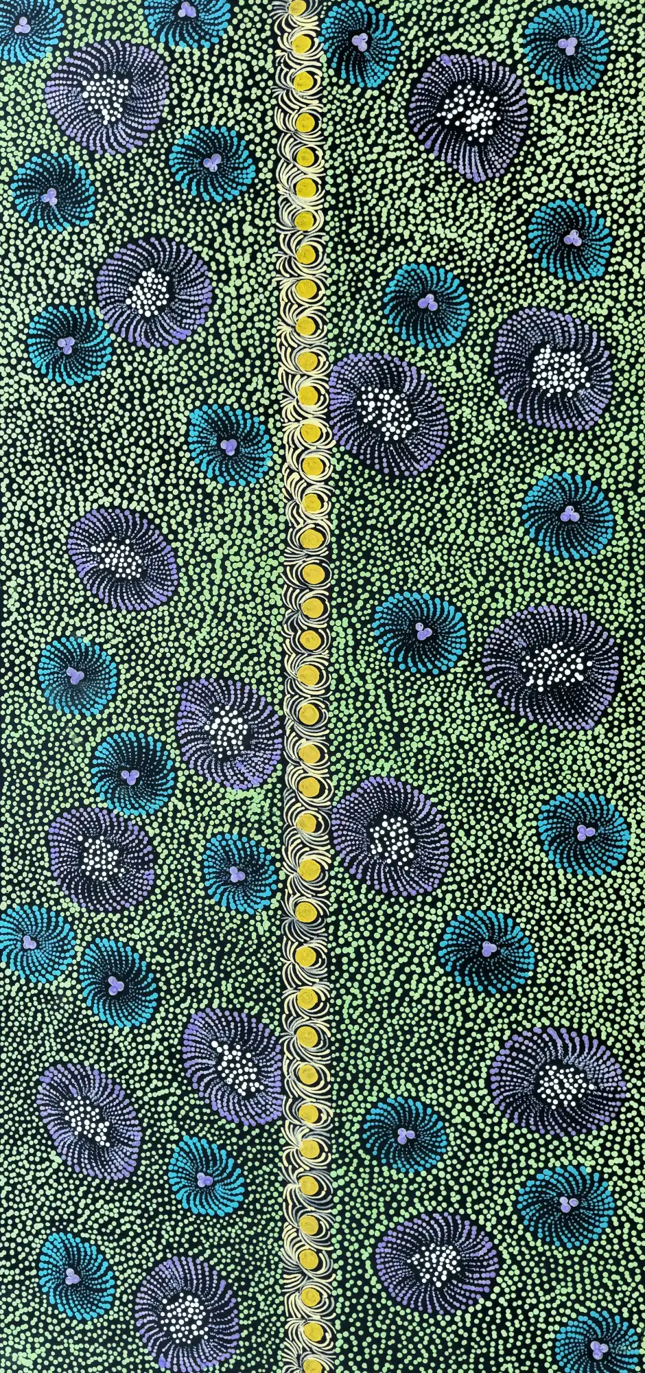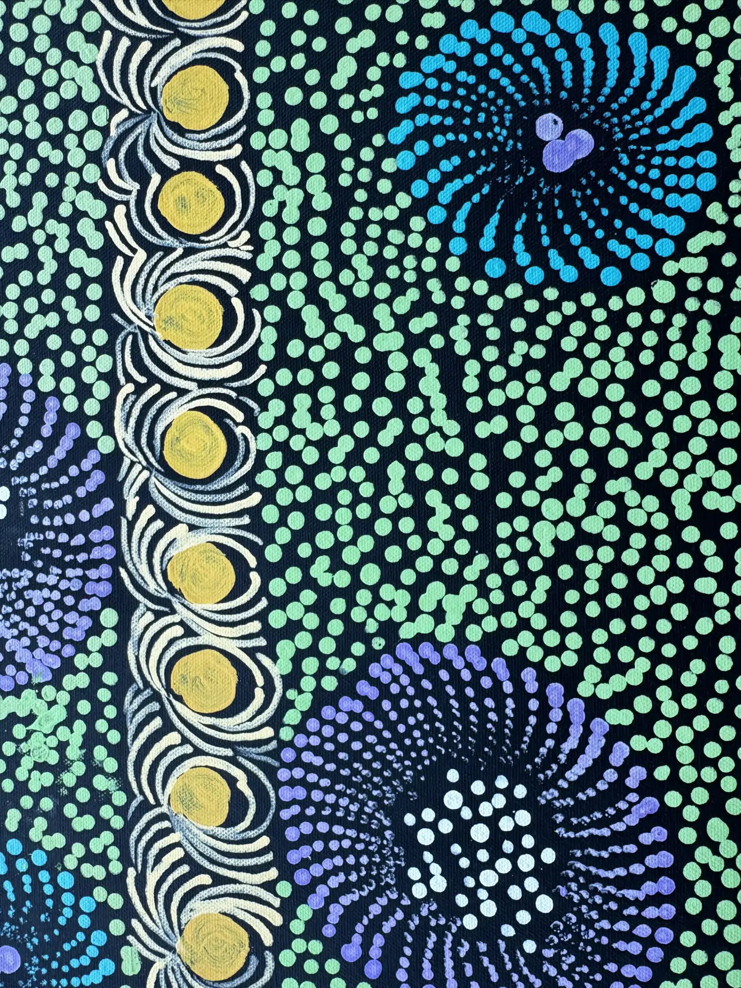 Maria’s work blends traditional iconography with her own modern style, bringing her cultural heritage to life. When she’s not painting, you can find her sharing stories with her grandchildren, hunting for honey ants during the rain, or collecting firewood to cook kangaroo tails. Her life and art are beautifully intertwined, reflecting the rich tapestry of her heritage and the stories she cherishes.