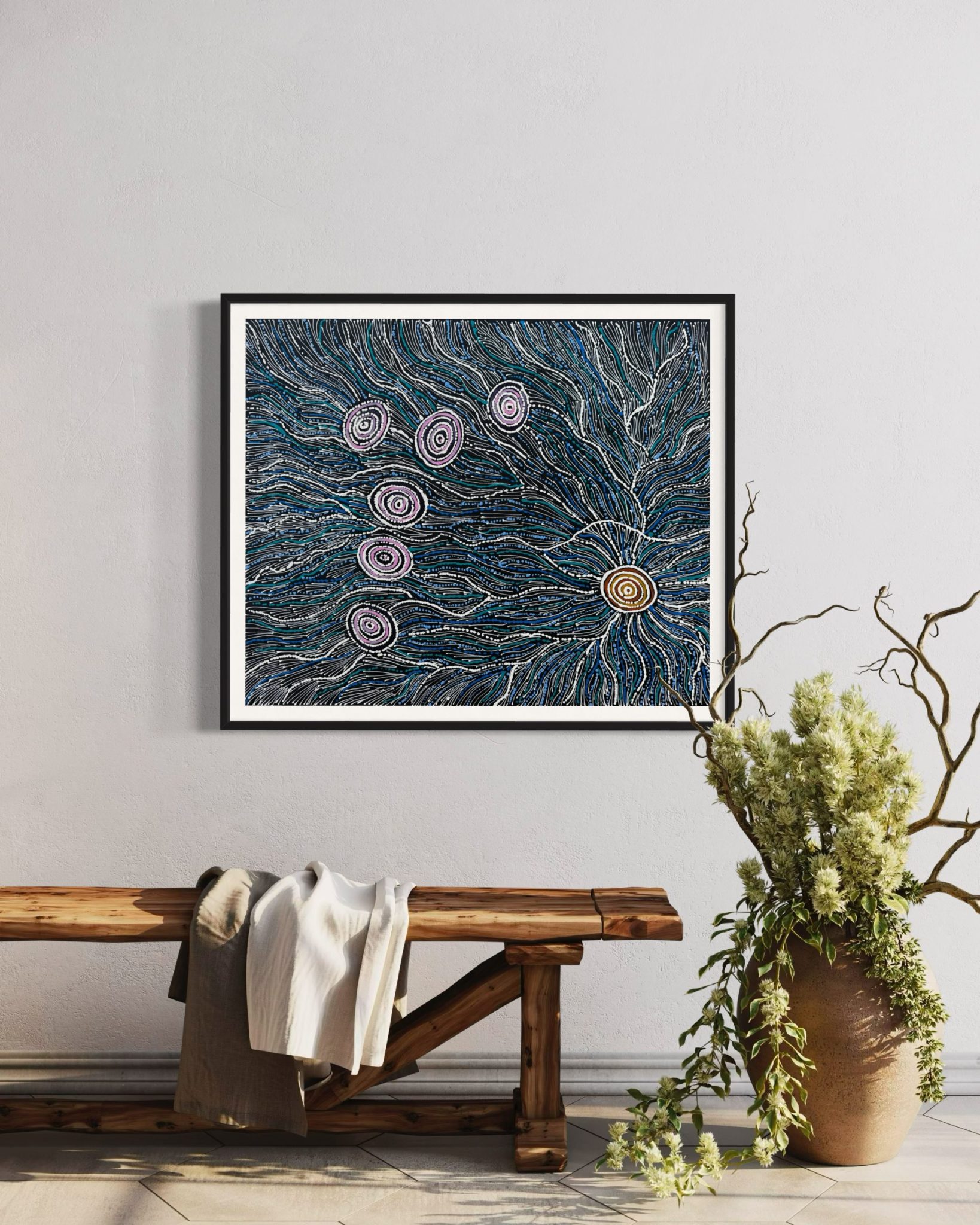 Maria’s work blends traditional iconography with her own modern style, bringing her cultural heritage to life. When she’s not painting, you can find her sharing stories with her grandchildren, hunting for honey ants during the rain, or collecting firewood to cook kangaroo tails. Her life and art are beautifully intertwined, reflecting the rich tapestry of her heritage and the stories she cherishes.